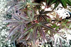 A dwarf Japanese maple with bright red spring foliage fading somewhat during the summer. Bright red foliage reemerges in fall.