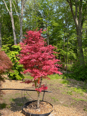 Spring leaves are light green and edged in red/pink which last into early summer. Gold crimson fall color. Upright grower