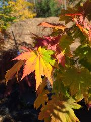 ‘Vitifolium’ typically grows over time to 10-15’ (less frequently to 20’) tall. It is noted for having large shallowly lobed leaves (to 6” across) with coarsely toothed margins. Leaves emerge with bronze tones, mature to green and develop excellent deep purple, orange and red fall colors. Cultivar name means grape leaf in reference to the similarity of cultivar leaves (folium) to those of some grapes (Vitis genus).